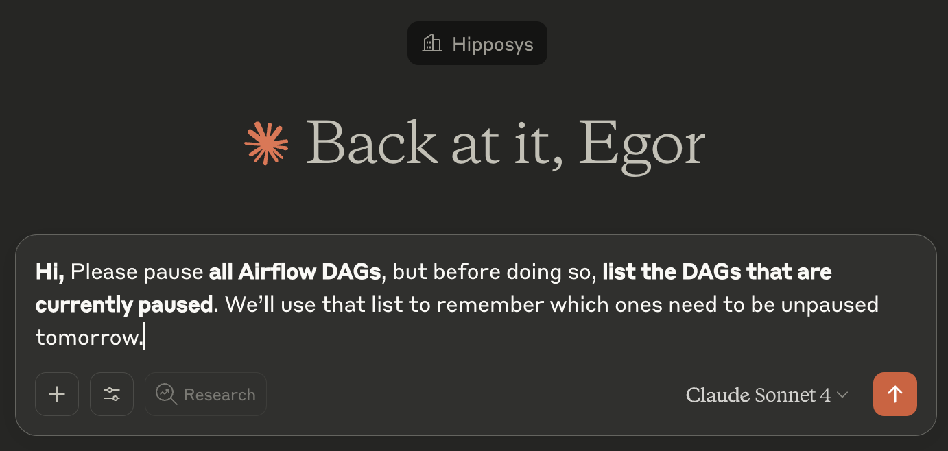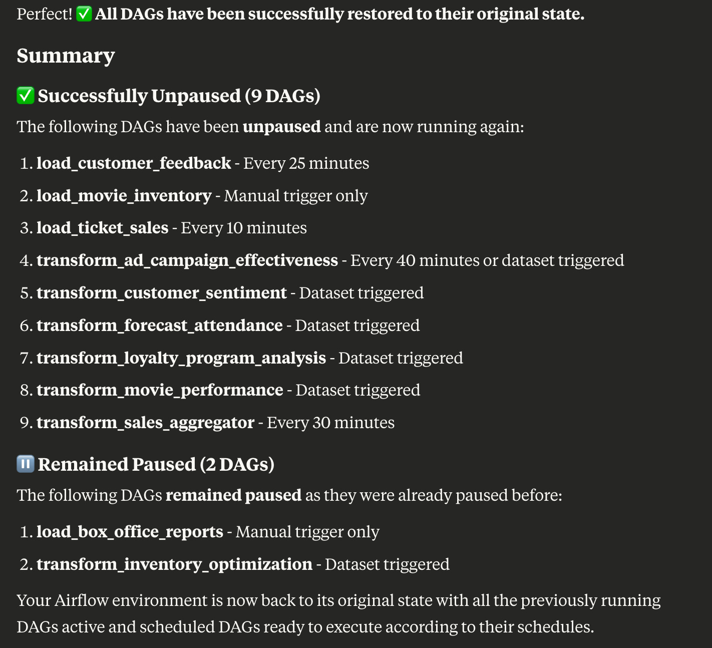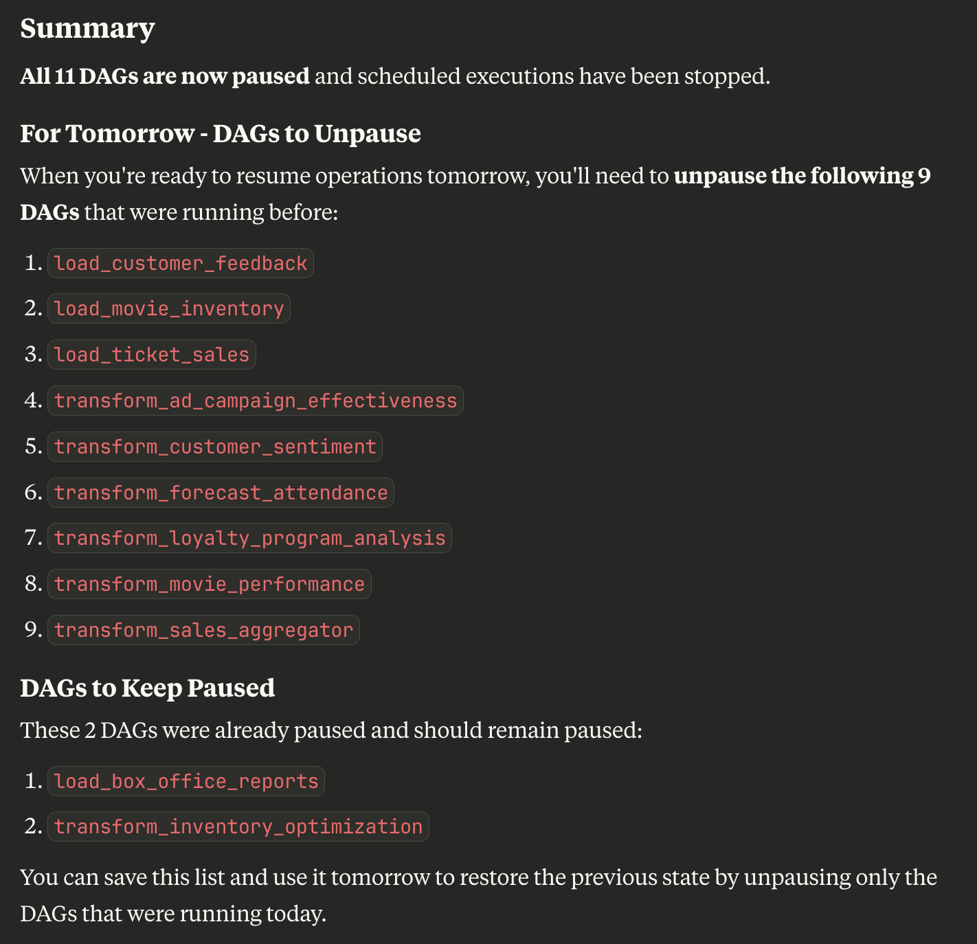 "Hi, please pause all Airflow DAGs, but before doing so, list the DAGs that are currently paused. We’ll use that list to remember which ones need to be unpaused tomorrow."
