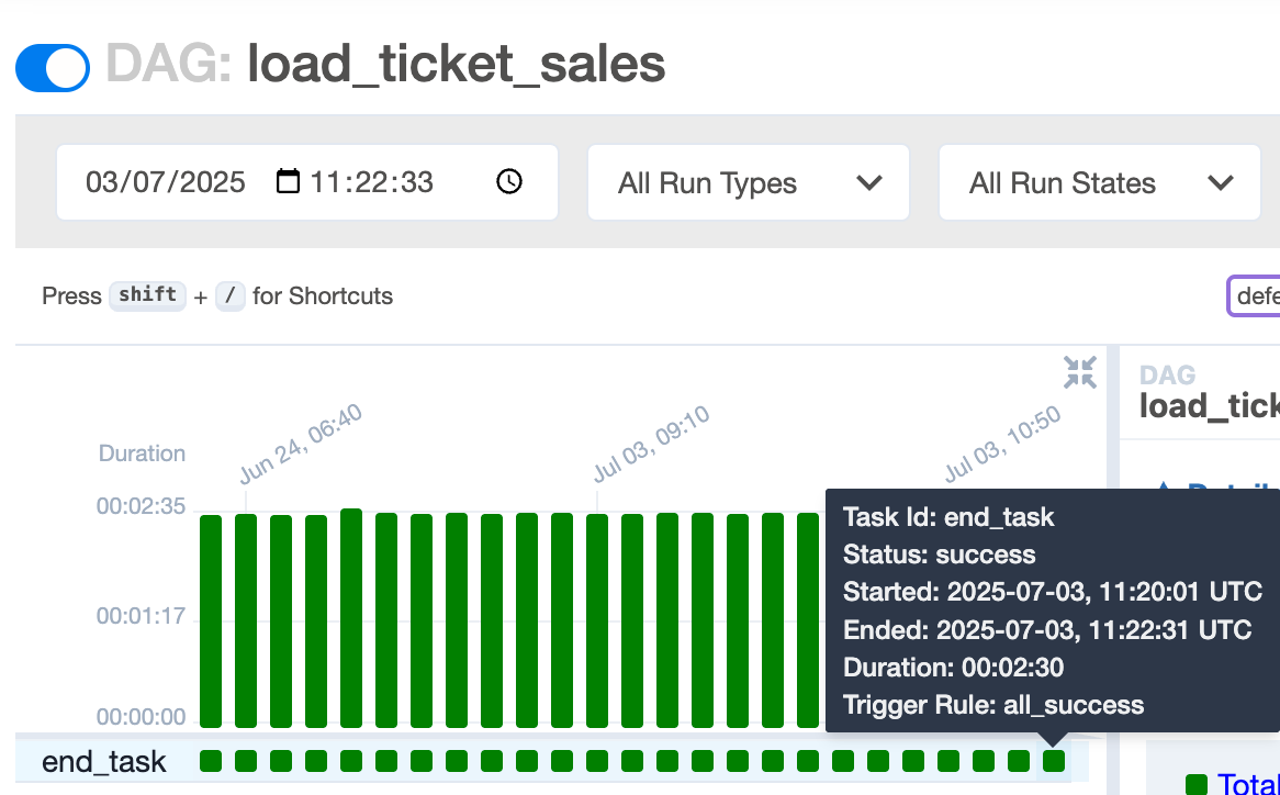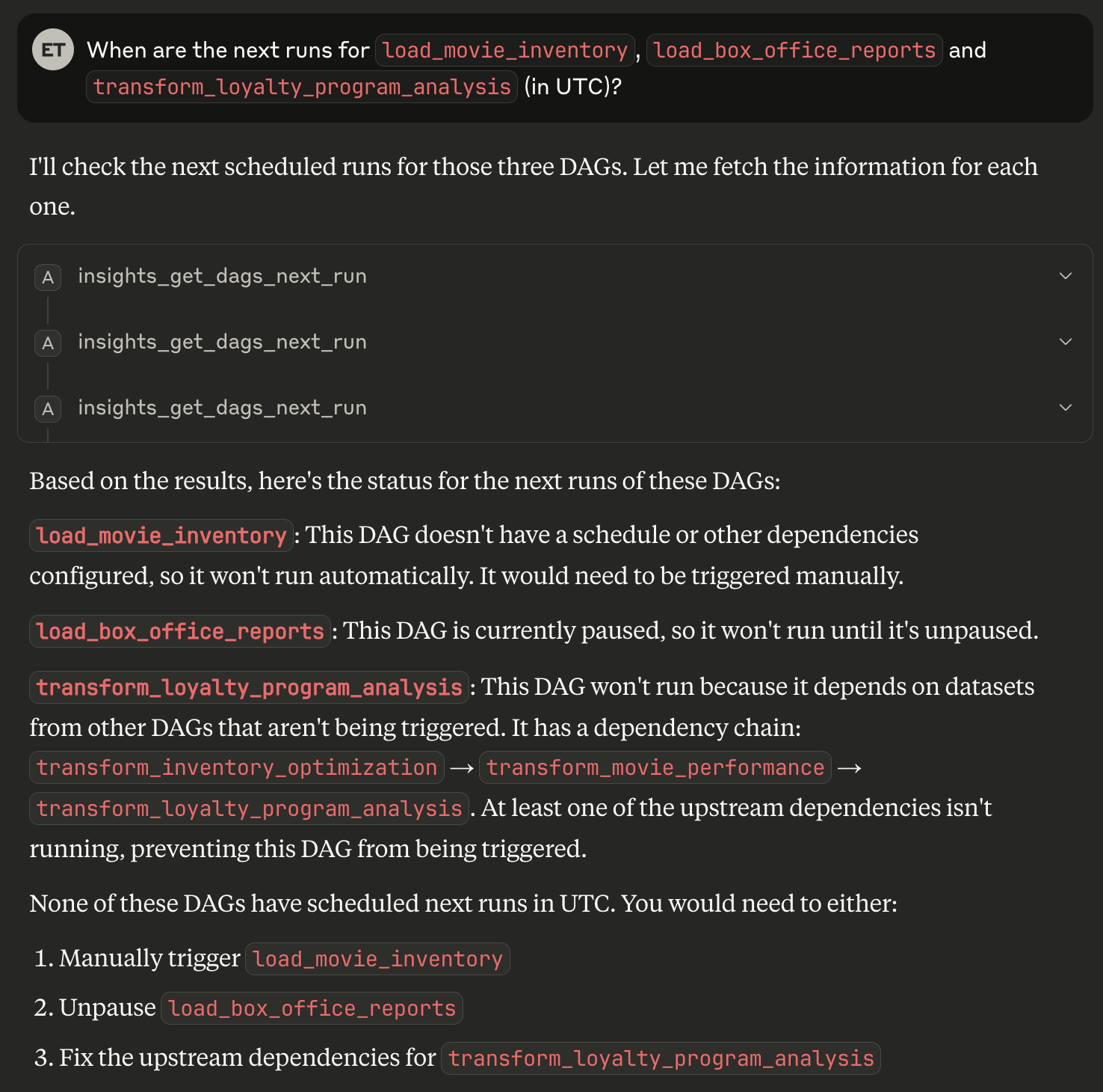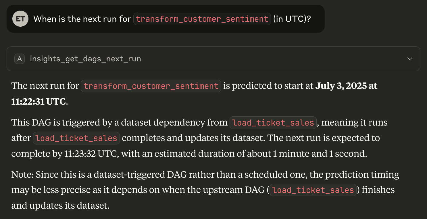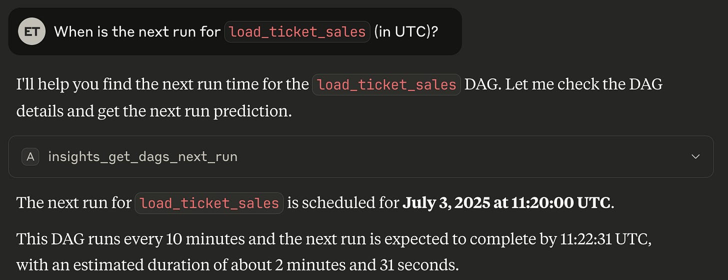After a short wait, you’ll get a detailed answer including the start time, end time, and expected duration—and it’s accurate. But that’s easy—load_ticket_sales is a scheduled DAG.