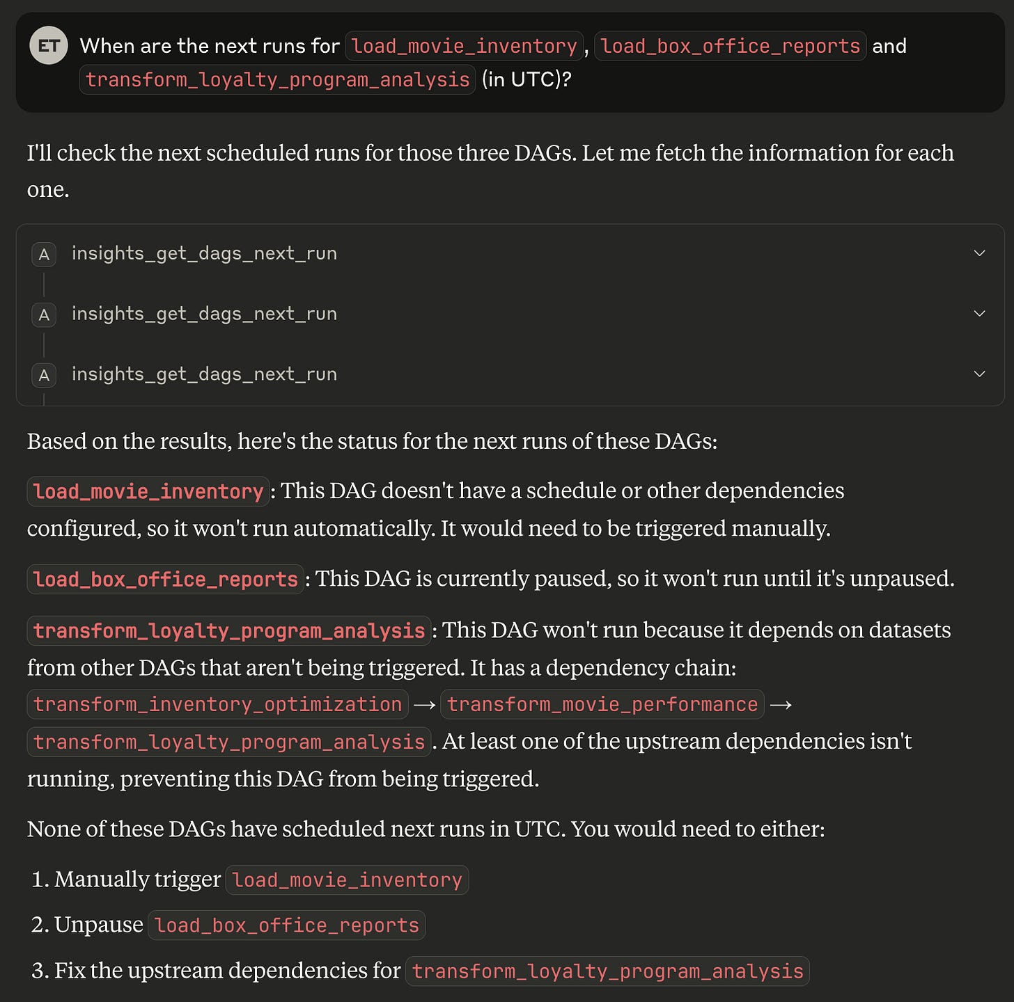 With just a few configuration changes, you can now monitor and predict future DAG runs directly from Claude Desktop—scheduled or event-driven. No guesswork, no surprises.