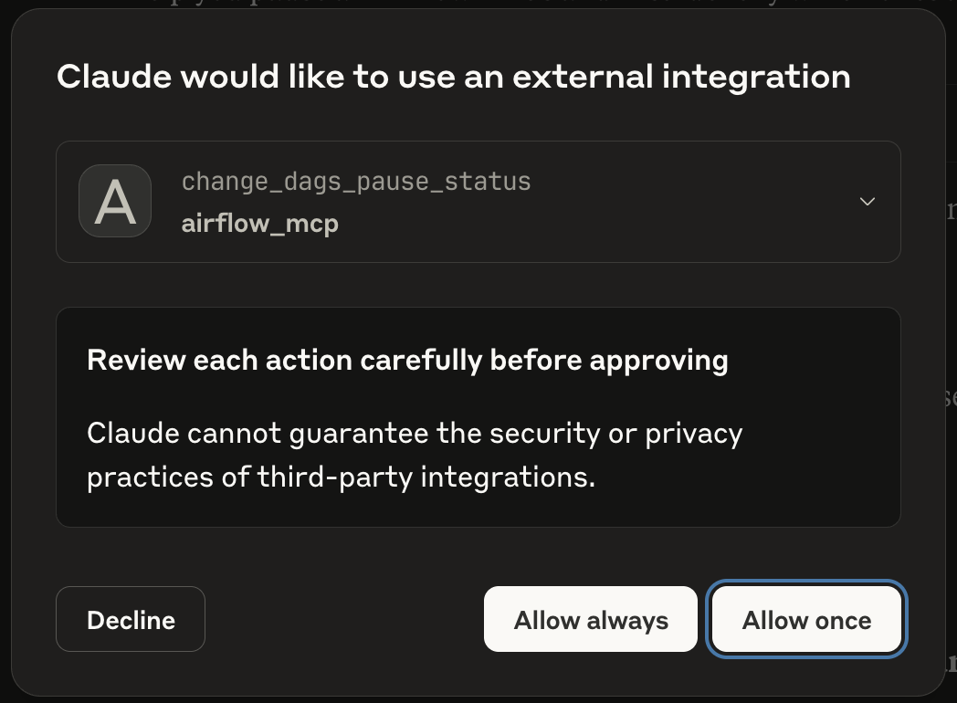 We realized that many users—especially those working with production Airflow instances—need to be certain that MCP won’t inadvertently alter DAG states. Even if your Airflow user has permission to run, pause, or delete DAGs, you may want to use MCP strictly for read-only access. That’s why Safe Mode is now the default behavior.