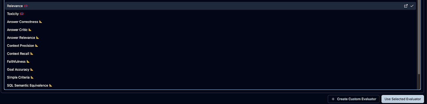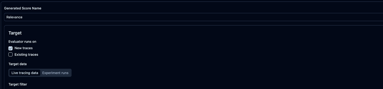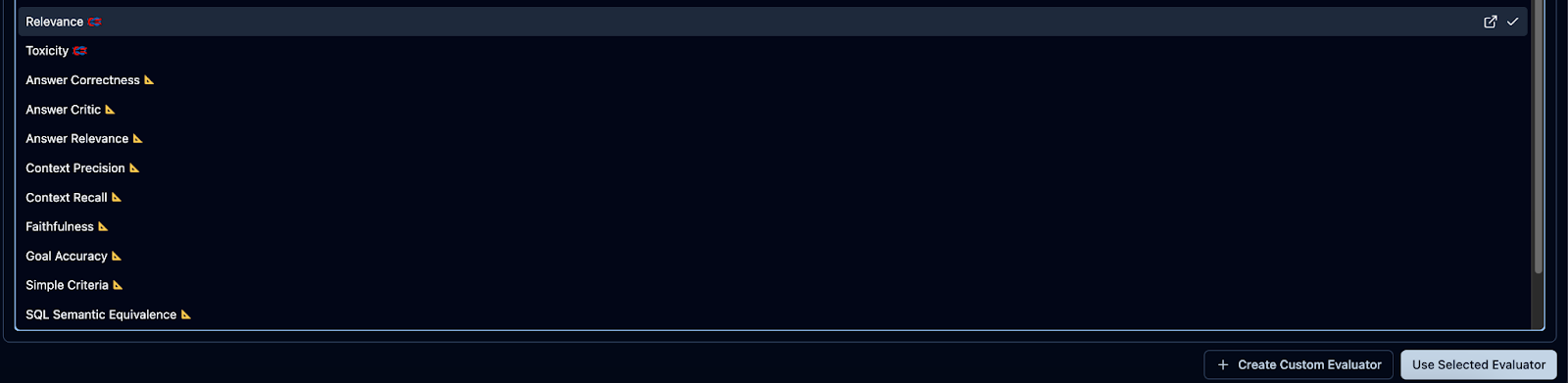 Then create a custom evaluator by navigating to Create Custom Evaluator → Create New Evaluator, and set up a Default Evaluation Model.Choose a metric—such as Relevance—and specify whether you want to evaluate existing traces or only new ones.