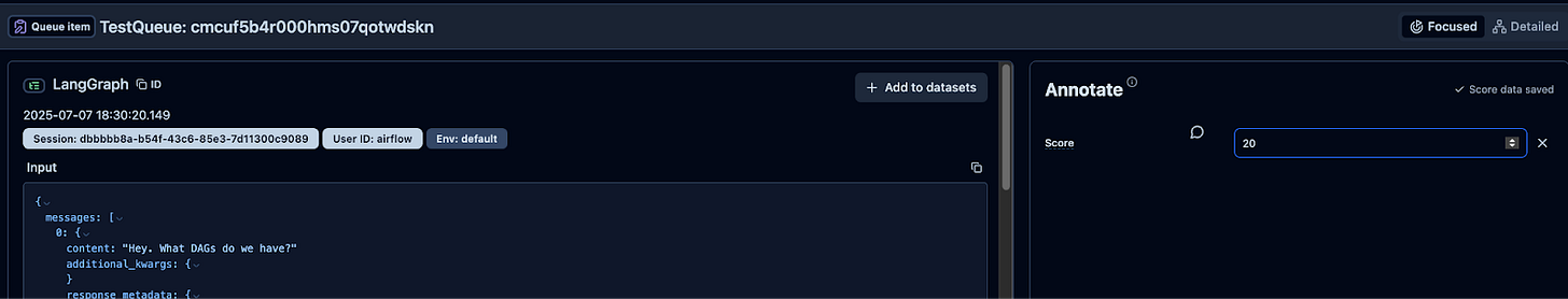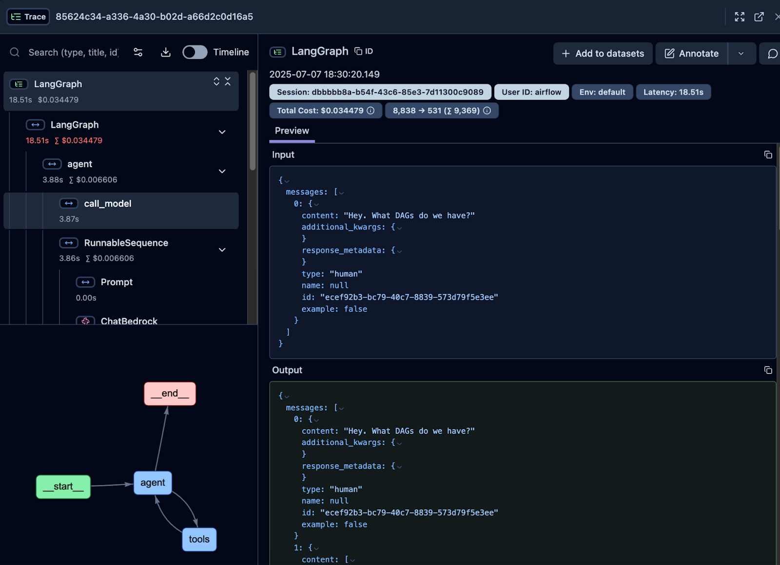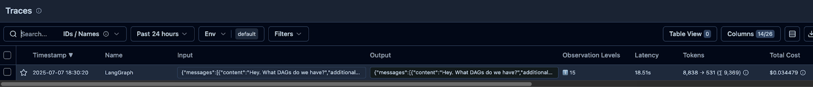 By combining the airflow-chat plugin with Langfuse, we’ve created a robust observability stack for LLM-powered workflows within Airflow. From real-time trace logging and cost tracking to advanced evaluation methods like LLM-as-a-judge, Langfuse brings clarity and control to your AI interactions. Whether you're debugging unexpected prompts, monitoring usage, or analyzing performance, Langfuse helps you iterate with confidence. For a deeper dive into all the features Langfuse offers, visit https://langfuse.com.
