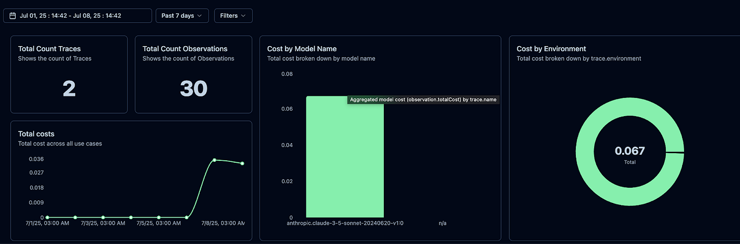 Langfuse makes it easy to track costs. In the Traces tab, you’ll see session-level costs, while the Home tab gives you an overview of model-level expenses. For deeper insights, head over to the Dashboards tab and explore the built-in Langfuse Cost Dashboard, or create a custom dashboard with your own cost graphs.