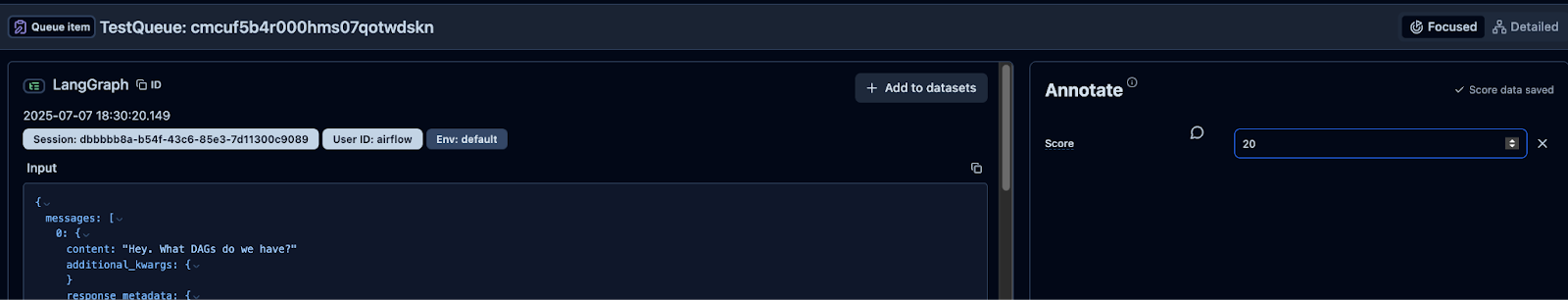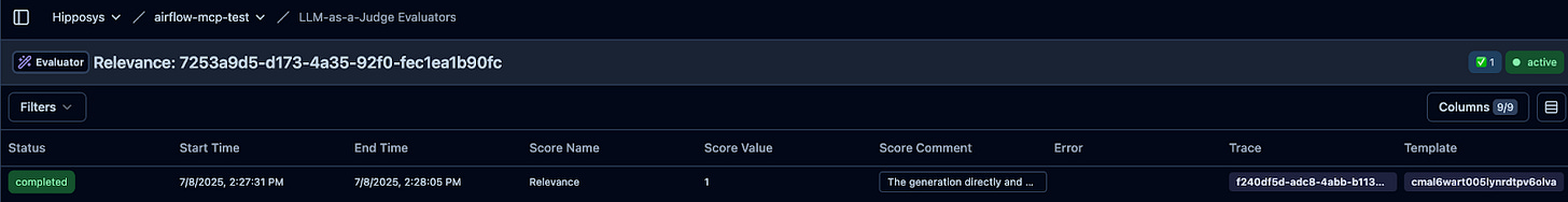 Now, go back to Airflow and ask a question. Check the Evaluation Logs and you’ll see a score and comment like: