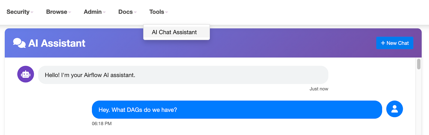Now, navigate to the Airflow UI, interact with the airflow-chat plugin, and ask a few test questions.