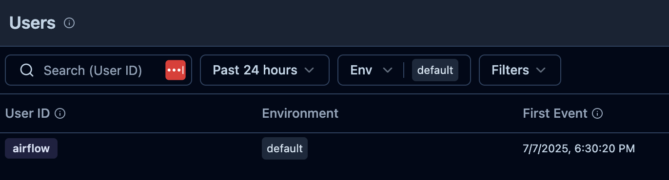 Navigate to the Users tab to see a list of application users. You’ll notice a user named "airflow"—this represents interactions made through the airflow-chat plugin. Click on it to view all associated sessions. This is a great way to monitor how your team is using the plugin over time.